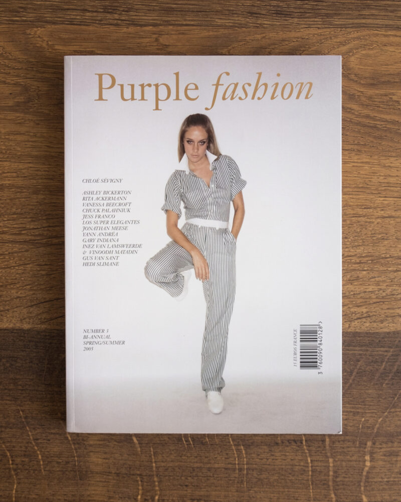 Purple Fashion Magazine. Number 3. Bi-annual Spring / Summer 2005 issue. Featuring Chloë Sevigny on the cover. An eclectic issue featuring articles, features and interview by and about Ashley Bickerton, Rita Ackermann, Vanessa Beecroft, Chuck Palahniuk, Jess Franco, Los Super Elegantes, Jonathan Meese, Yan Andréa, Gary Indiana, Inez van Lamsweerde & Vinoodh Matadin, Gus Van Sant and Hedi Slimane.