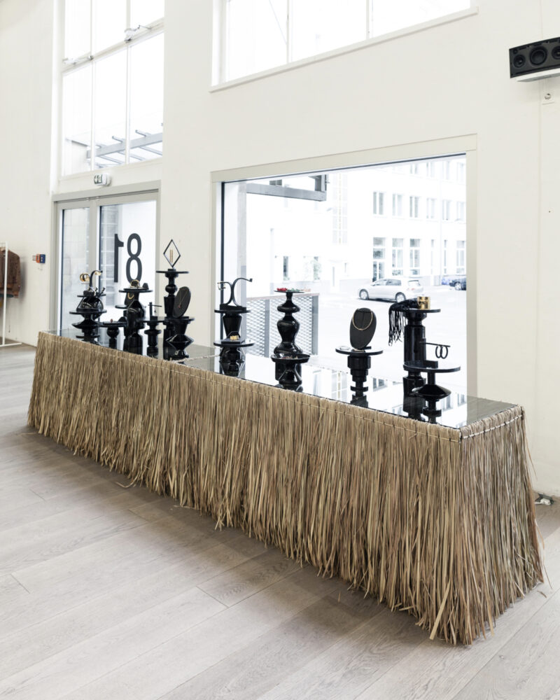 A selection of jewelry pieces from the CÉLINE Spring / Summer 2016 collection was displayed atop a grass-skirted table at STORE 81 as part of Gallery Weekend Berlin 2016. Created especially by CÉLINE for ANDREAS MURKUDIS, the table was made only of natural materials, including wood, dried grass and stained-glass. Minimal pieces of jewelry were suspended from sculptural frames which were stacked on top of dark ceramic vessels by LINCK.