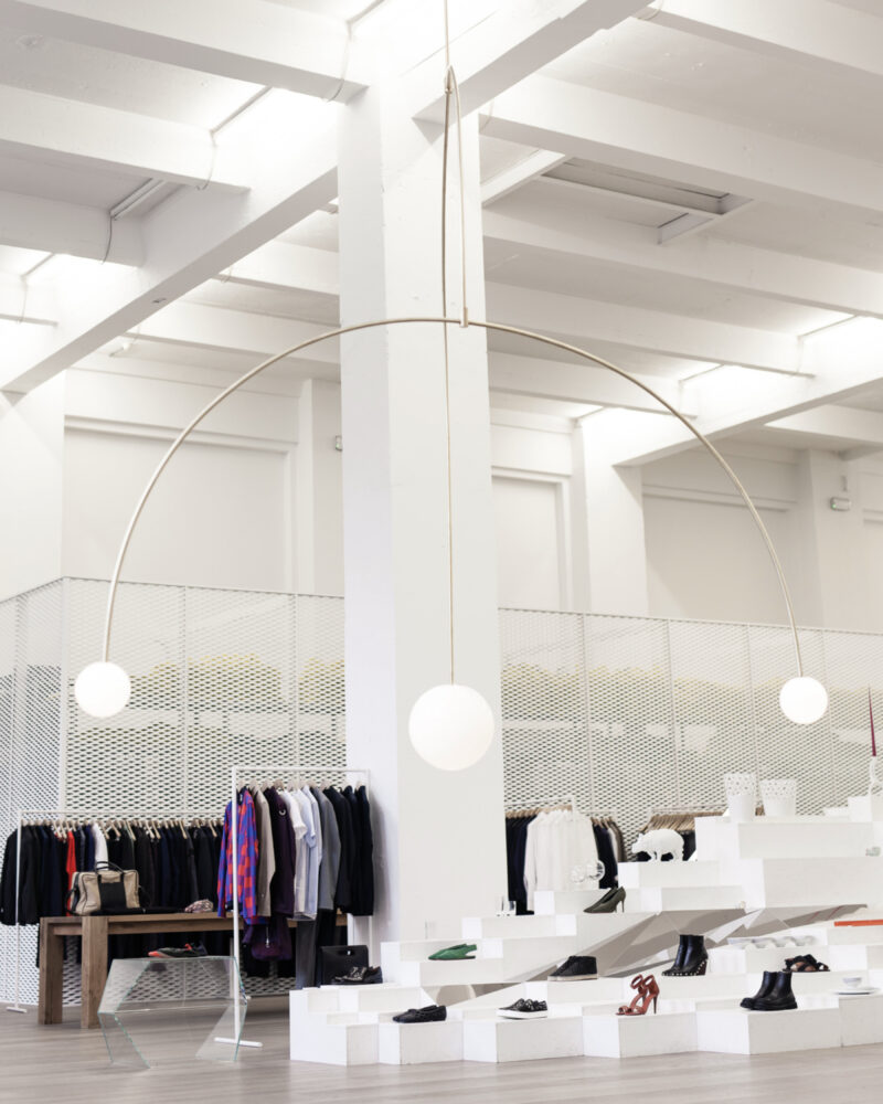A pair of exquisite mobile chandeliers by London-based designer Michael Anastassiades were unveiled at STORE 81 for Gallery Weekend Berlin 2016, subtly illuminating the beautiful products on display. Mouth-blown opaque glass globes were hung from curved frames of patinated brass in a delicate choreography of light and balance. The London-based designer's ethos of using family-run workshops and traditional materials chimes perfectly with Andreas' own conception of luxury. One of the two chandeliers hangs in the large shop windows of STORE 81 to this day.