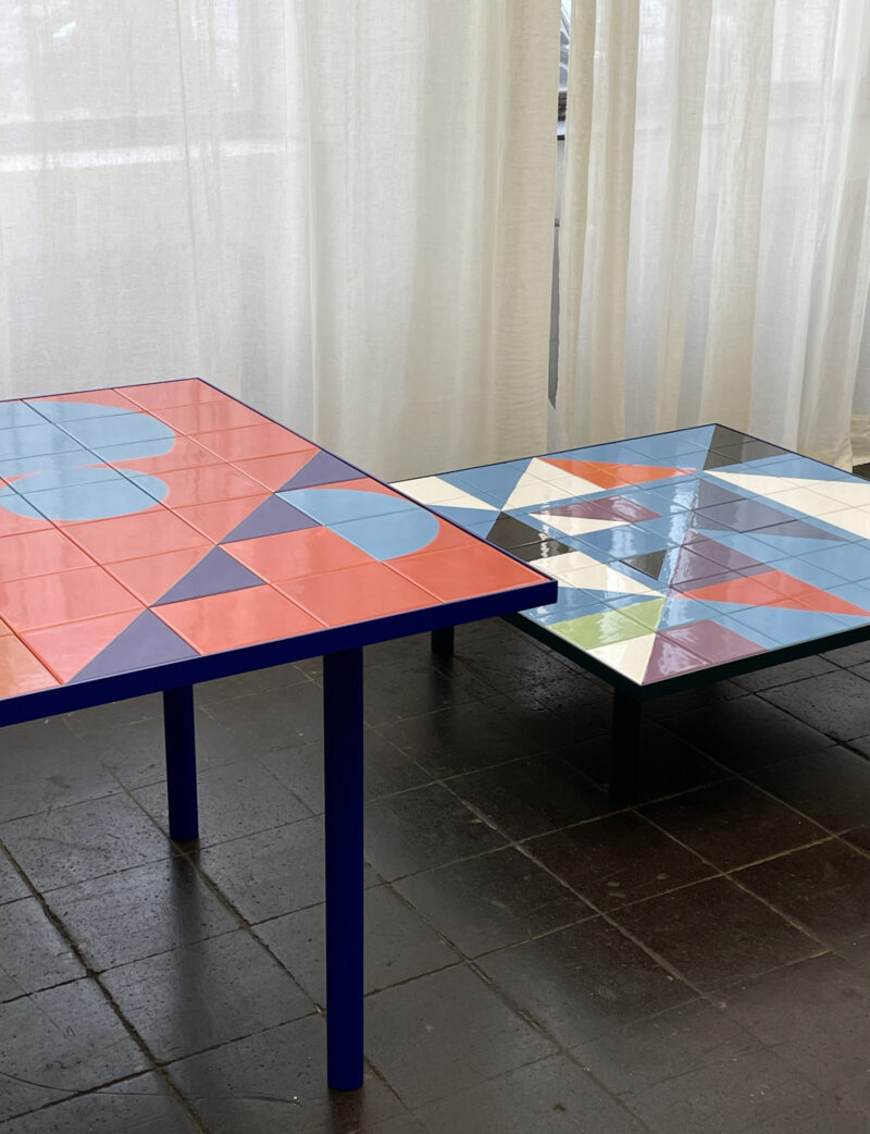 Berlin-based artist Claudia Wieser designed five tabletop motifs for German furniture brand E15 using her signature tile art. Two artist-edition tables were showcased at ANDREAS MURKUDIS during Berlin Art Week 2024. Featuring colorful tiled tops and colored steel frames, each style was limited to four editions, including an artist’s proof. This collaboration, "EDITION CLAUDIA WIESER," marked Wieser’s first product design with E15. Both Wieser and E15 founder Philipp Mainzer attended the Opening Event to celebrate the launch of these unique table artworks.