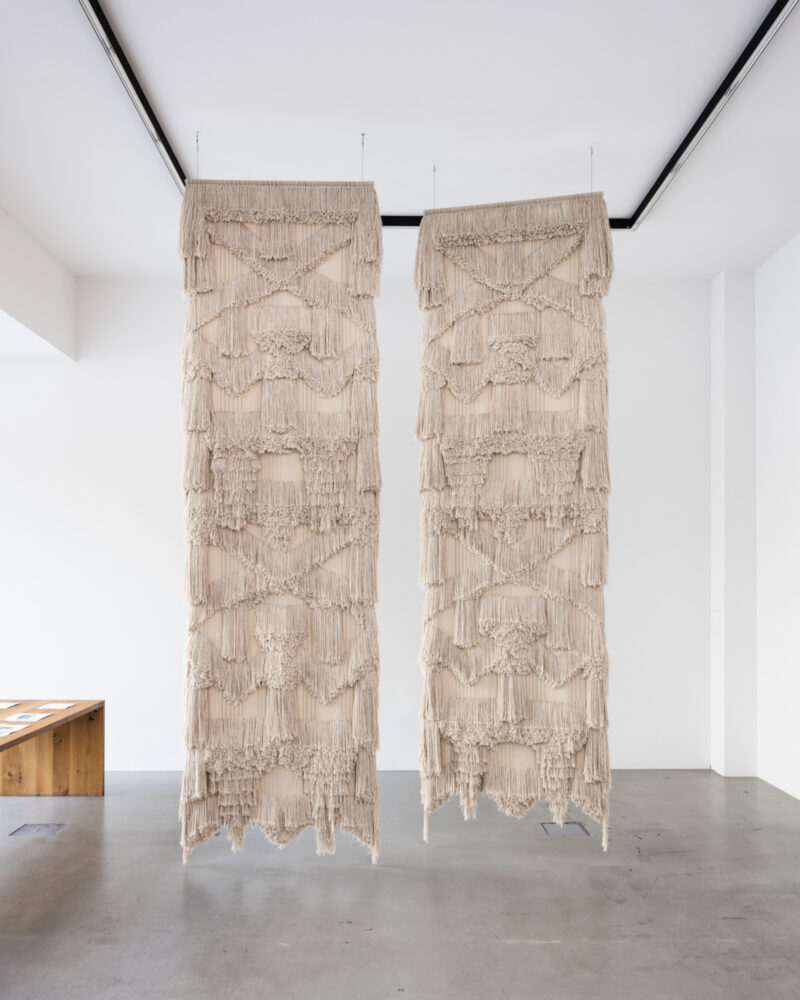 For Art Week 2023, ANDREAS MURKUDIS opened ‘There is a new sun, everyday, a ball of fire.’ – an exhibition of bespoke textile artworks, as well as preliminary watercolor paintings, by Cypriot artist and weaver Joanna Louca. One of the large tasseled pieces was mounted to the wall, while the other three hung freely from the ceiling. Joanna Louca created from a desire to conceive a handmade environment. Calculated and drafted on paper with watercolors, then woven by thread, these dense and impressive textile works were on display in STORE 77 and Joanna Louca attended the opening event.