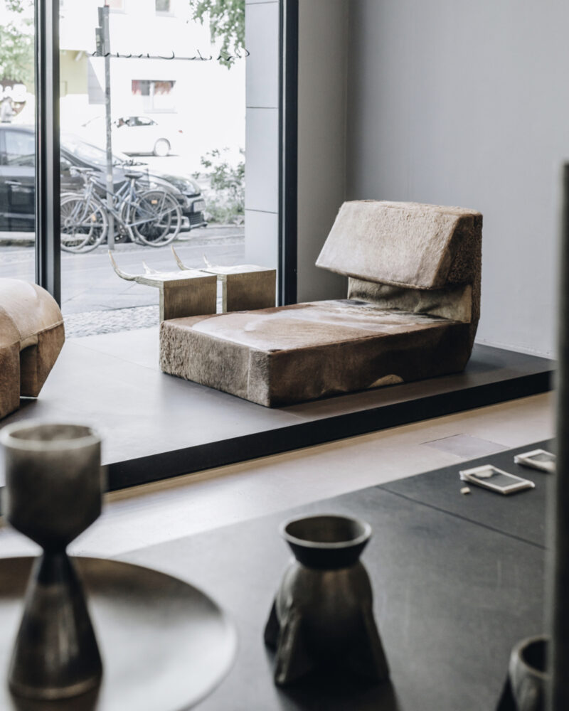 During Gallery Weekend Berlin 2019, a temporary RICK OWENS store was launched at STORE 77, presenting his Ready-to-Wear collection, his BIRKENSTOCK collaboration and, exclusively in Germany, his latest furniture designs. His furniture collections are inspired by the works of Eileen Gray to Brâncuși to the silhouettes of Californian skateparks. They consist of raw plywood, marble, and moose antlers. Michèle Lamy performed during the opening night to music by producer Rocco Rampino. The event took place in cooperation with Audi City Berlin, HIGHSNOBIETY and BIRKENSTOCK.